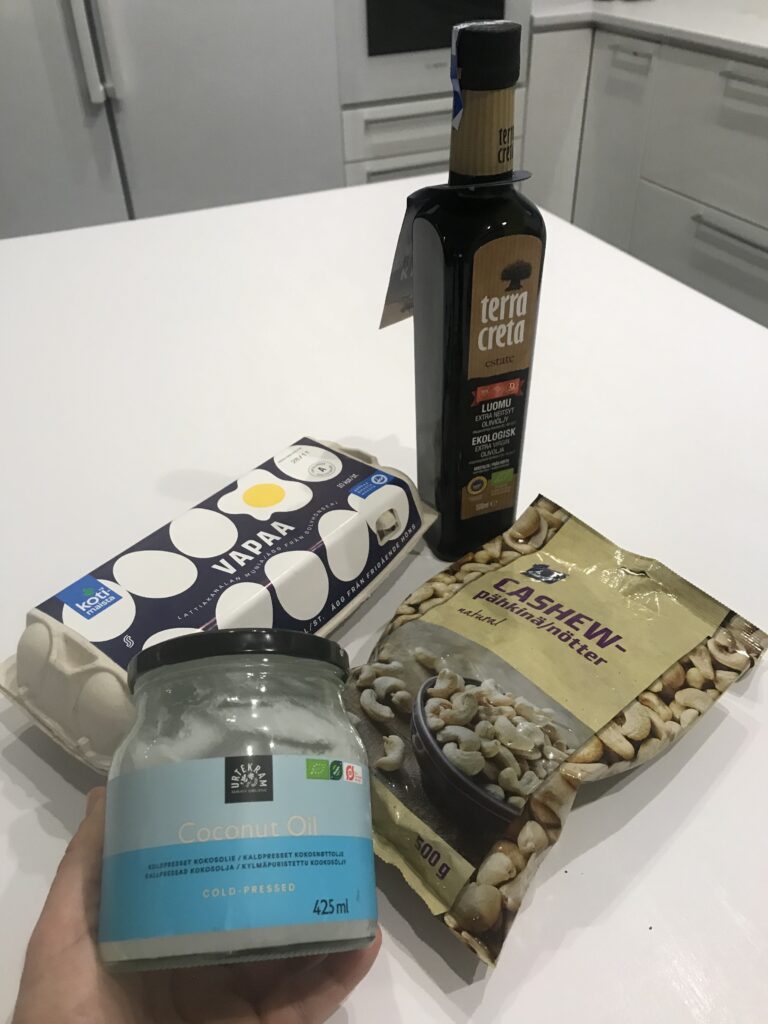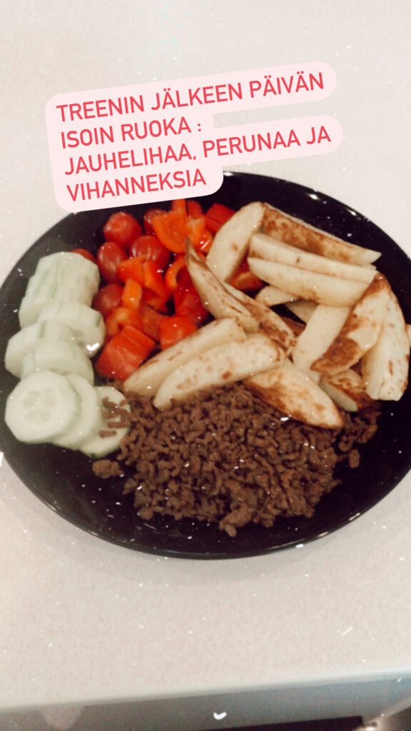 Kuten huomaatte joka aterialla on runsaasti hiilihydraatteja, välipalalla ainoastaan vähemmän. Lisään rasvoja jokaiselle aterialle paitsi treenin jälkeiseen ruokaan.